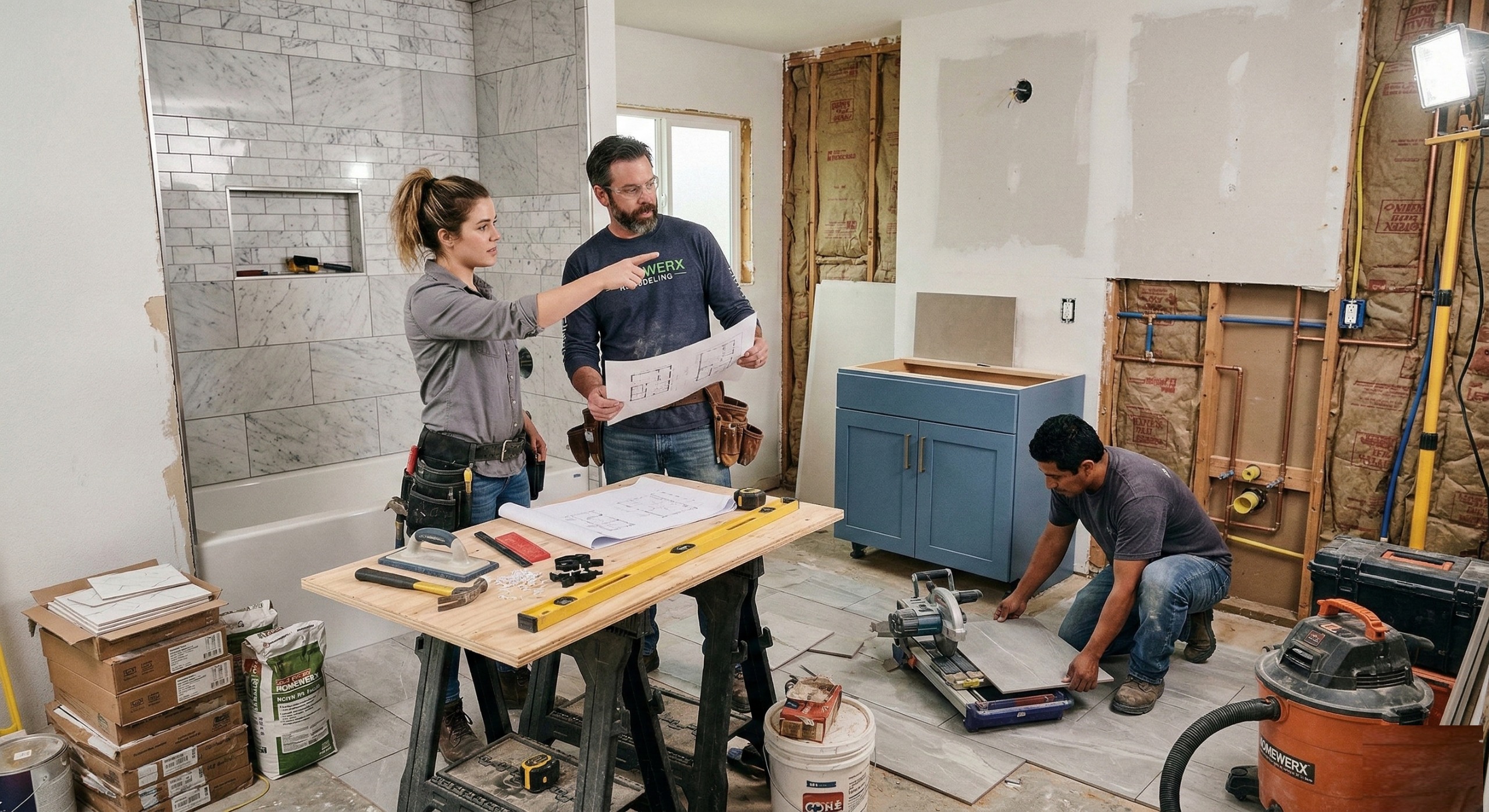 Bathroom remodel with waterproofing-first sequencing