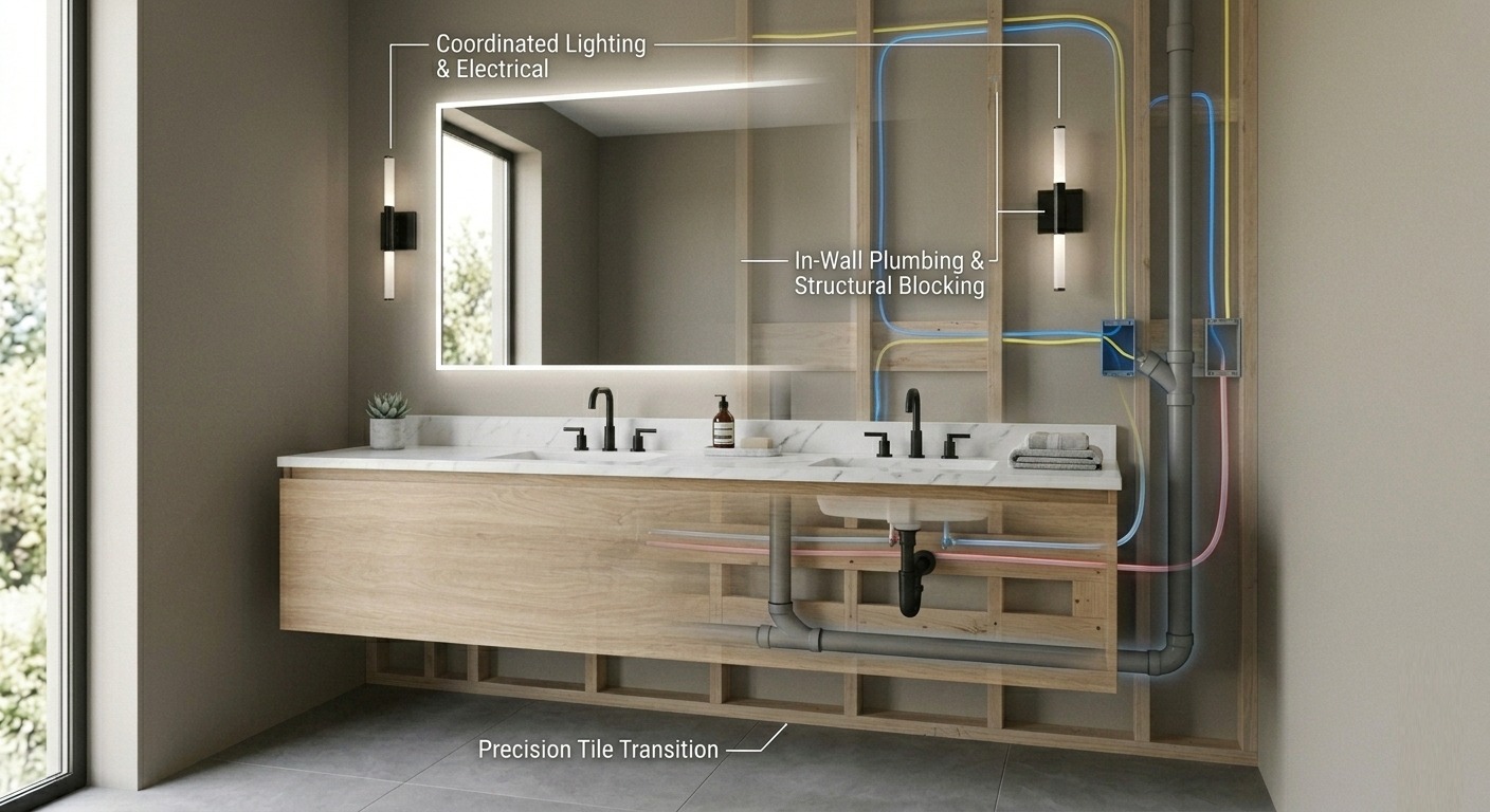Coordinated vanity install, lighting placement, and finish work sequencing -