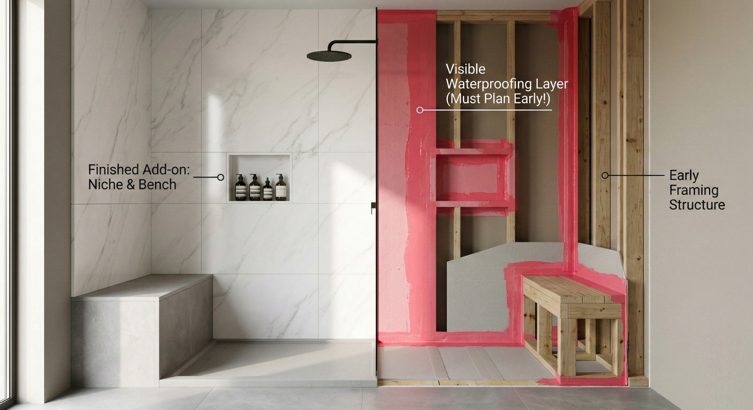 Niches, benches, shelves, and custom edges add function and a cleaner look, but they also increase waterproofing and tile detail work. If you want them, decide early so framing and waterproofing are planned from the start.