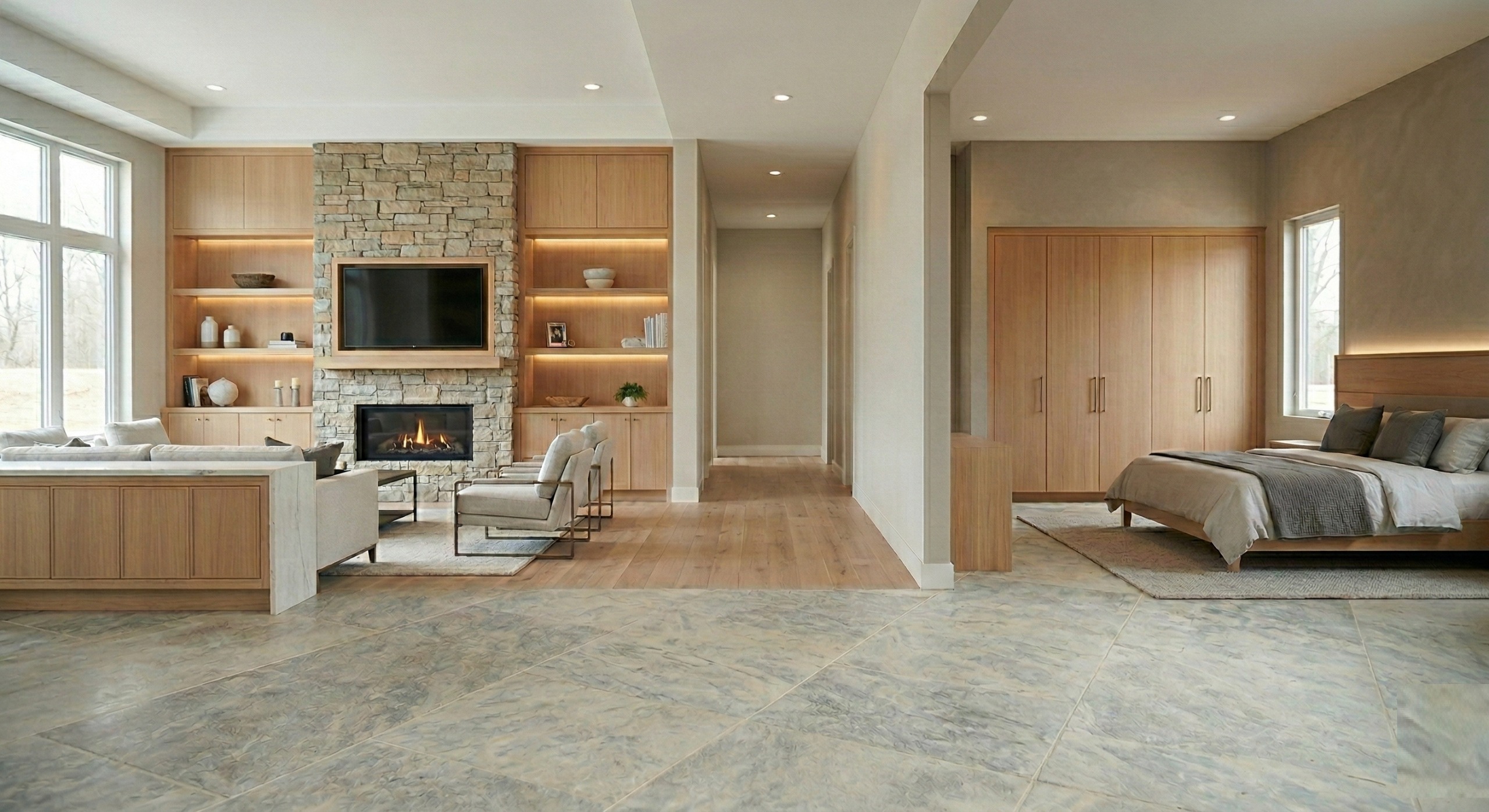 Coordinated tile, cabinetry, and flooring transitions for clean alignment -