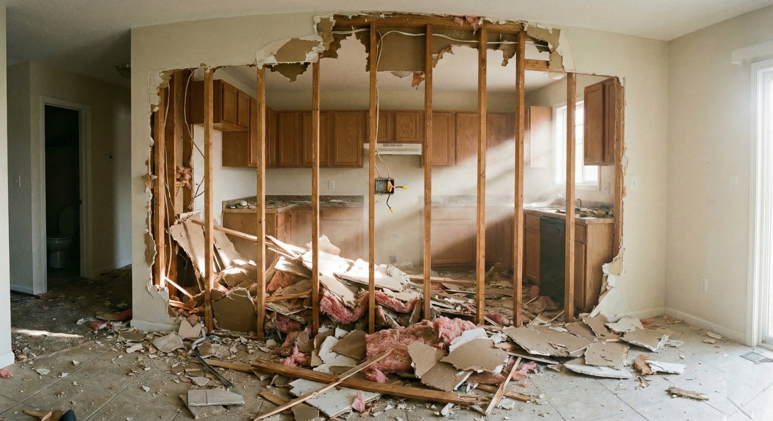 If water intrusion occurred, drying and mitigation should be addressed first, then rebuild and restoration work can proceed once conditions are stable. After that handoff, we can scope structural repairs and the finish restoration needed to put the space back together.